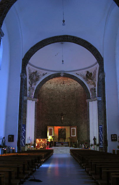 Source:WTL photo in the Plaza de las Tres Culturas, Mexico, D.F. Image : The nave of the Templo de Santiago, with the high altar (altar mayor) at the far end of the nave. Comments: Although this interior has been remodelled several times over the centuries, nevertheless, the stark simplicity of the original style has been well preserved. Notice how little exterior light there is. |