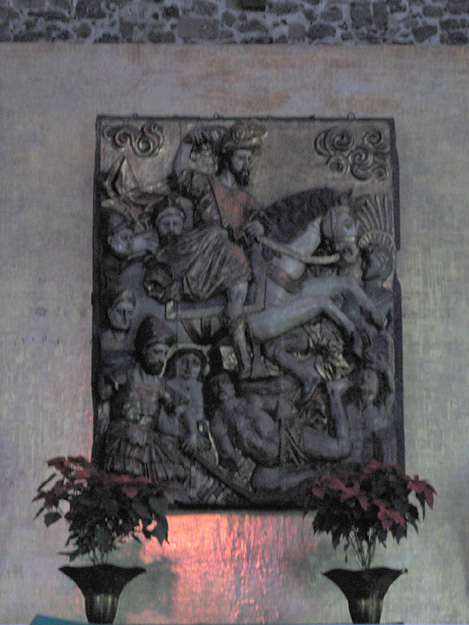 Source:WTL photo in the Plaza de las Tres Culturas, Mexico, D.F. Image: Polychrome bas-relief panel of St. James on a wall in the Templo de Santiago. Comments: This sculpture is a typical rendering of the episode in which the knight-like Saint kills Moors with his sword while his horse tramples on them. |