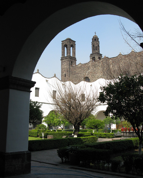 Image: The Templo de Santiago is in the background. In the foreground is the cloister of the Convent de Santiago de Tlatelolco. Construction was begun in 1535. The upper part of the convent walls was remodelled in the 18th century, but the outside of the convent retains the features of its 16th century origins (see: <= Tlatelolco #9a).
