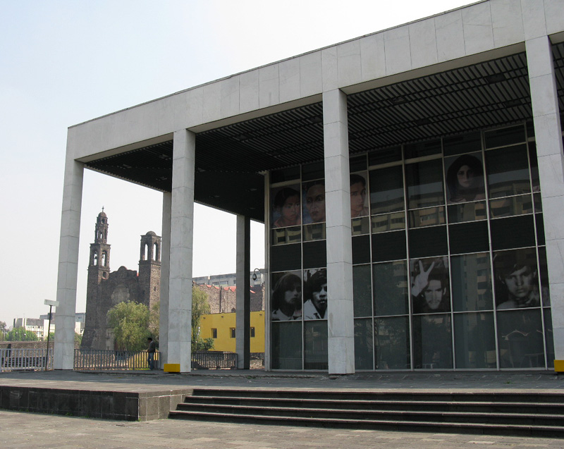 Source:WTL photo in the Plaza de las Tres Culturas, Mexico, D.F. Image: The Templo de Santiago seen through the columns of a very modern building next to the archeological site of the ruins of Tlatelolco and the Church of St. James. |
