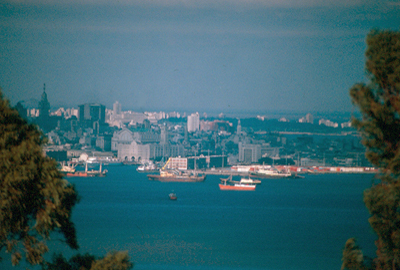 Comments: Here you see two views (the one on the right was taken with a 500 mm telephoto lens) of Montevideo taken from a park on the far side of the bay. Montevideo is the capital and largest city (1,400,000) of Uruguay (population: 3,500,000). Generally speaking, Montevideo has the reputation of being one of the most "livable" cities in Latin America. It was founded in 1726 as a defensive fortress opposite Buenos Aires to guard the entrance to the Río de la Plata. Also, as you see especially in the photo on the right, Montevideo from the beginning and continuing in the present has been a major shipping port. Nowadays, there are elegant high rises and condos lining the popular beaches in the Pocitos neighborhood of Montevideo.