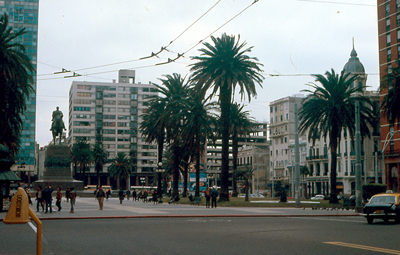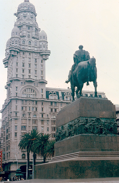 Source: WTL digitized slide photograph© on site in Montevideo, 1985. Comments: Two photos of the Plaza de la Independencia. On the left, the best angle for a photo on a gray day. On the right the Palacio Salvo, as described above. The monument in both photos is of José Gervasio Artigas Arnal 1764 – 1850), the Uruguayan national hero who is known as the father of Uruguayan independence. |