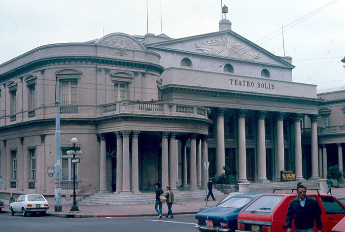 Source: WTL digitized slide photograph© on site in Montevideo, 1985. Hace 120 años, el argentino Miguel Cané decía refiriéndose al Solís: "América del Sur no posee un solo teatro que pueda presentarse como rival y muchas grandes ciudades europeas lo desearían y lo mostrarían al viajero como una obra digna de examen". (One hundred twenty years ago, the Argentinian Miguel Cané said this about the Solís Theater: "South America does not have a single theater that can rival it, and many great European cities would like to have it as an attraction for tourists as a monument worth visiting.) Humanities topic: Compare and contrast this grand theater with those in Havana, Buenos Aires, Mexico City, and Rio de Janeiro. |