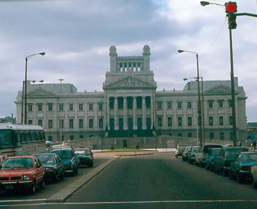 Source: WTL digitized slide photograph© on site in Montevideo, 1985. Comments: Here you see the main façade of the Palacio Legislativo, where the Uruguayan congress (Asamblea General) is housed. The building was constructed between 1904 (President José Batlle y Ordóñez) and 1925 (President José Serrato); the latter year, for Uruguayans, marked the first centennial of their independence, which, as you can tell from Uruguay's chronology, is a rather complicated affair. The architects were Italians: Vittorio Meano and Gaetano Moretti. Uruguay has two houses, the Chamber of Deputies (Cámara de Diputados, 99 members) and the Cámara de Senadores (31 members). All members serve five-year terms. In the 2009 congressional elections, here are the results by political party and the percent of the vote each received: Broad Front (47%); National Party (29%); Colorado Party (17%); Independent Party (2%). Humanities topics: Topic 1: compare and contrast the architecture of this building with similar buildings on any three other countries including at least one other one from Latin America. Topic 2: Speculate on why Uruguay chose Italian architects to design this important national building as opposed to, say, French or USA architects. |
