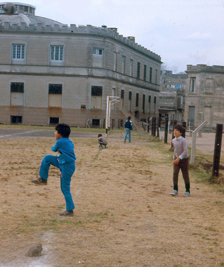 Source: WTL digitized slide photograph© on site in Montevideo, 1985. Comments: A scene like this one--boys playing sandlot fútbol (soccer) may or may not exist in this precise location a couple of blocks from the center of Old Montevideo (this was primer property, so it is probably the site of a highrise office building or condos) but it surely exists somewhere in Montevideo and throughout the country. Note that Uruguay is traditionally a fairly powerful soccer country in South America and in World Cup competition. In 1978, Uruguay played in the World Cup final, losing to Argentina, and they will play in the World Cup final again in 2010. Humanities question: In what sense do you think a sport, especially football/fútbol/soccer can be considered one of Latin America's humanities fields? |