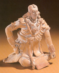 (A) Identify the following image. (A) What are some of the principal symbolic features of such a warrior? (C)What is this figure holding in his right hand, and what might it be used for? |